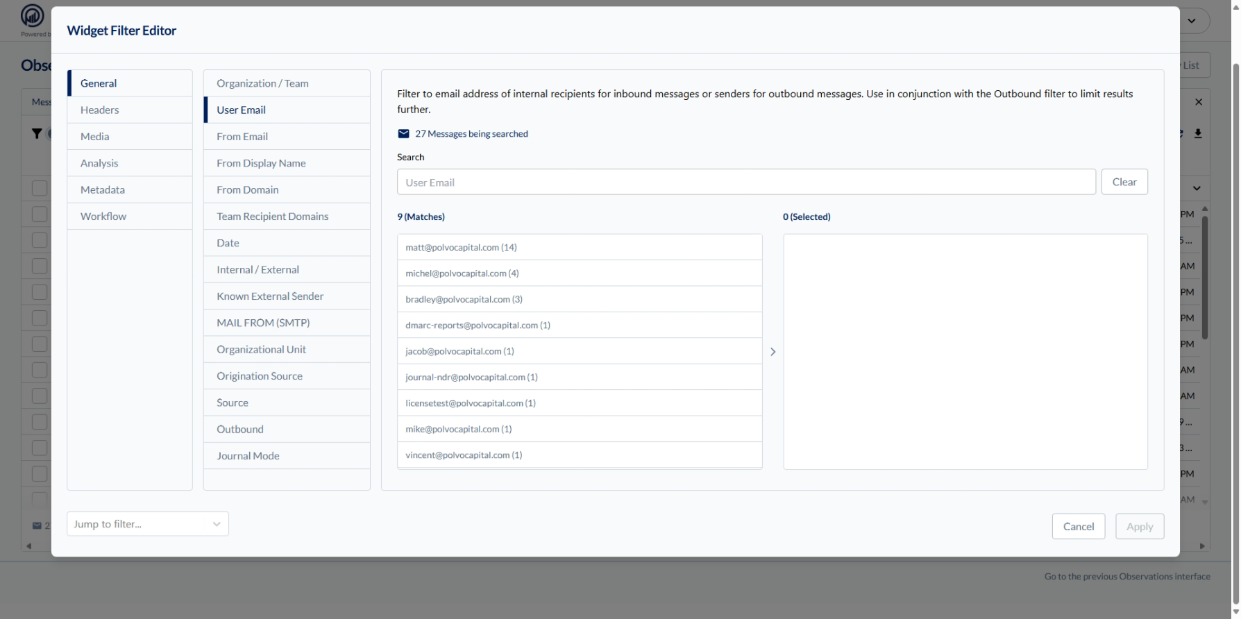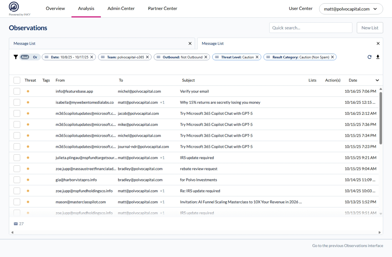 Observations is INKY's detailed email analysis view. Every email INKY processes appears here with complete threat intelligence, delivery routing, and remediation options.