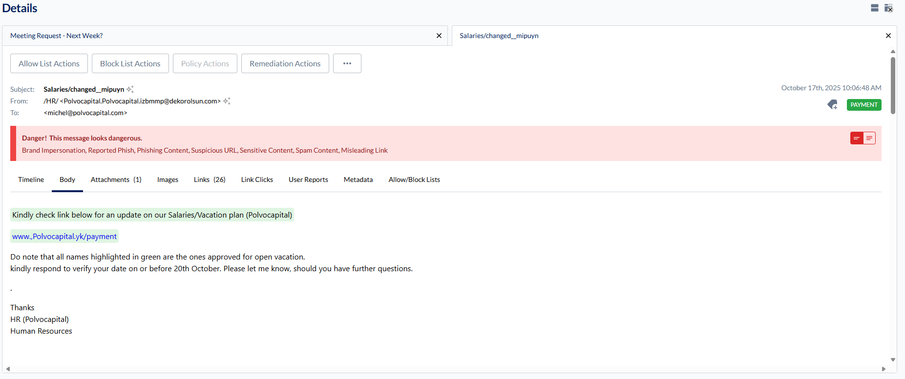 Action(s) - Automated actions taken (quarantine, delivery, modification)