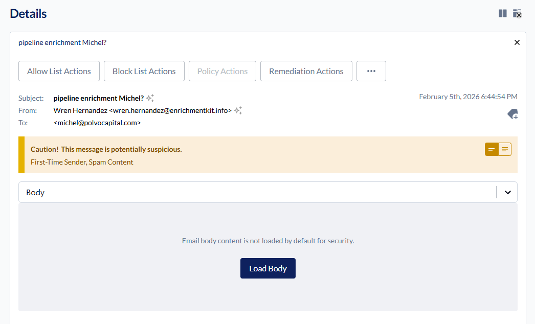 Note: Email body content requires explicit action to load as a security enhancement. This protects administrators from potential risks when analyzing malicious emails. The body content is fetched only when you click the Load Body button and is not automatically loaded when switching between observations.