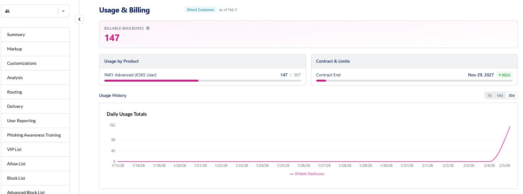 Monitor your mailbox usage, contract status, and product allocation from the INKY Settings page.