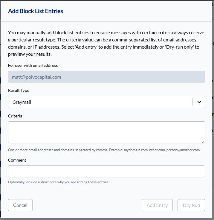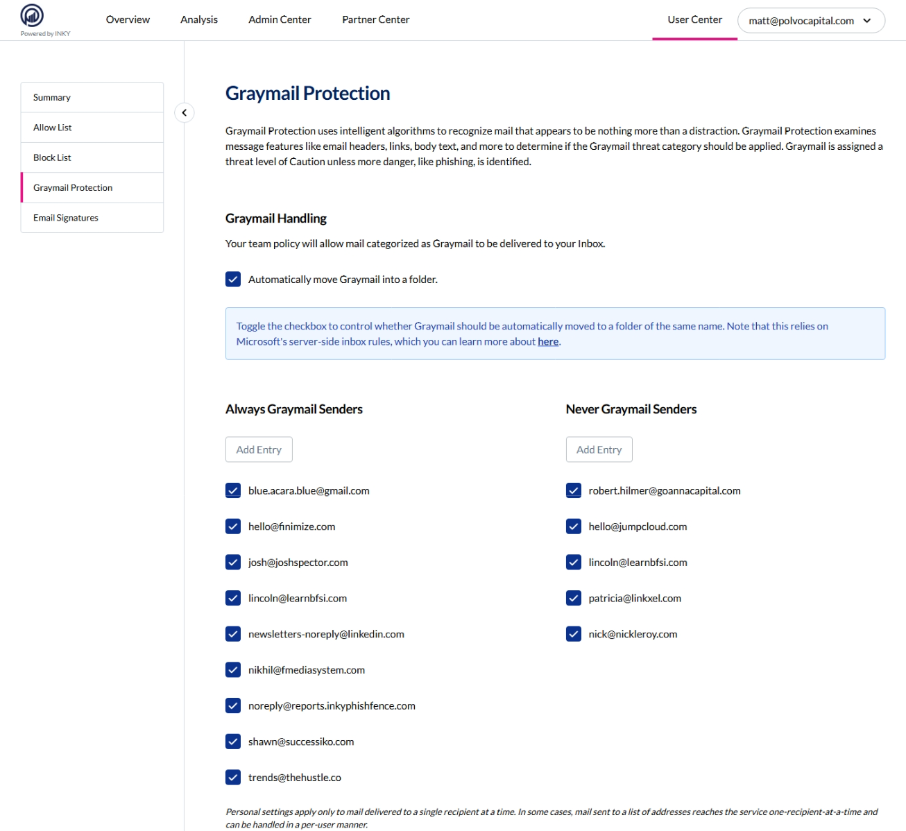 Always Graymail: Senders you want treated as graymail even if INKY doesn't detect it (e.g., newsletters@company.com).