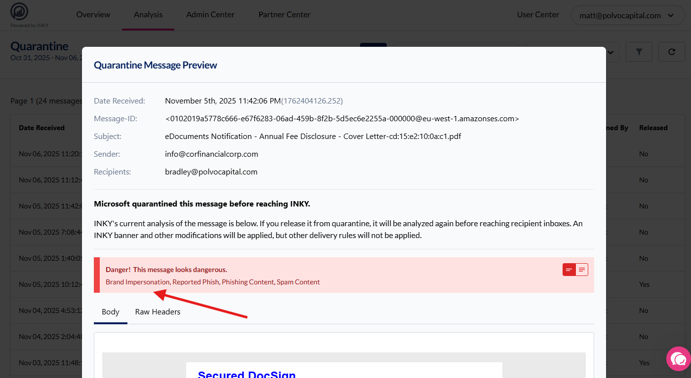 Quarantine message previews now include full INKY analysis even for messages quarantined by Microsoft before reaching INKY's processing pipeline.