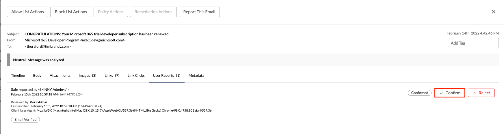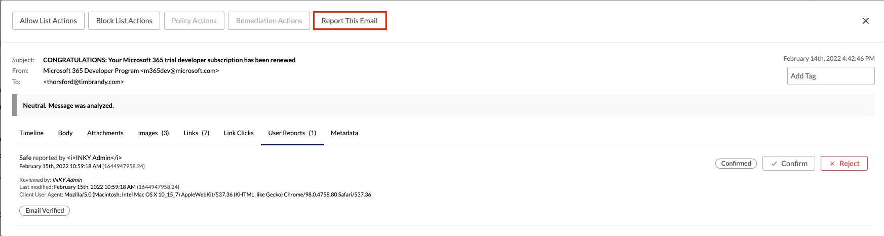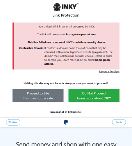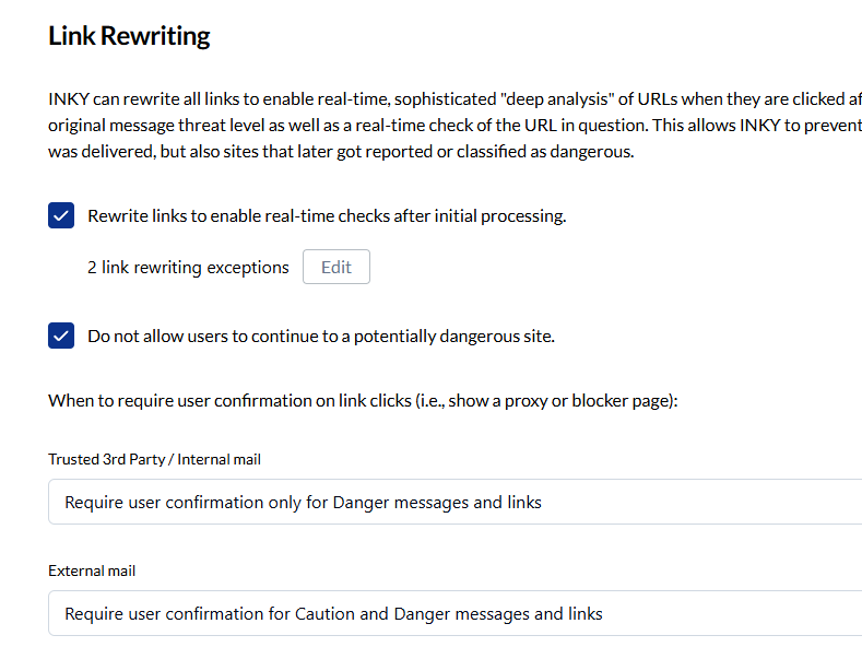 INKY rewrites all links in emails to route clicks through real-time analysis. This catches threats that become active after delivery and helps users evaluate risks before reaching dangerous sites.
