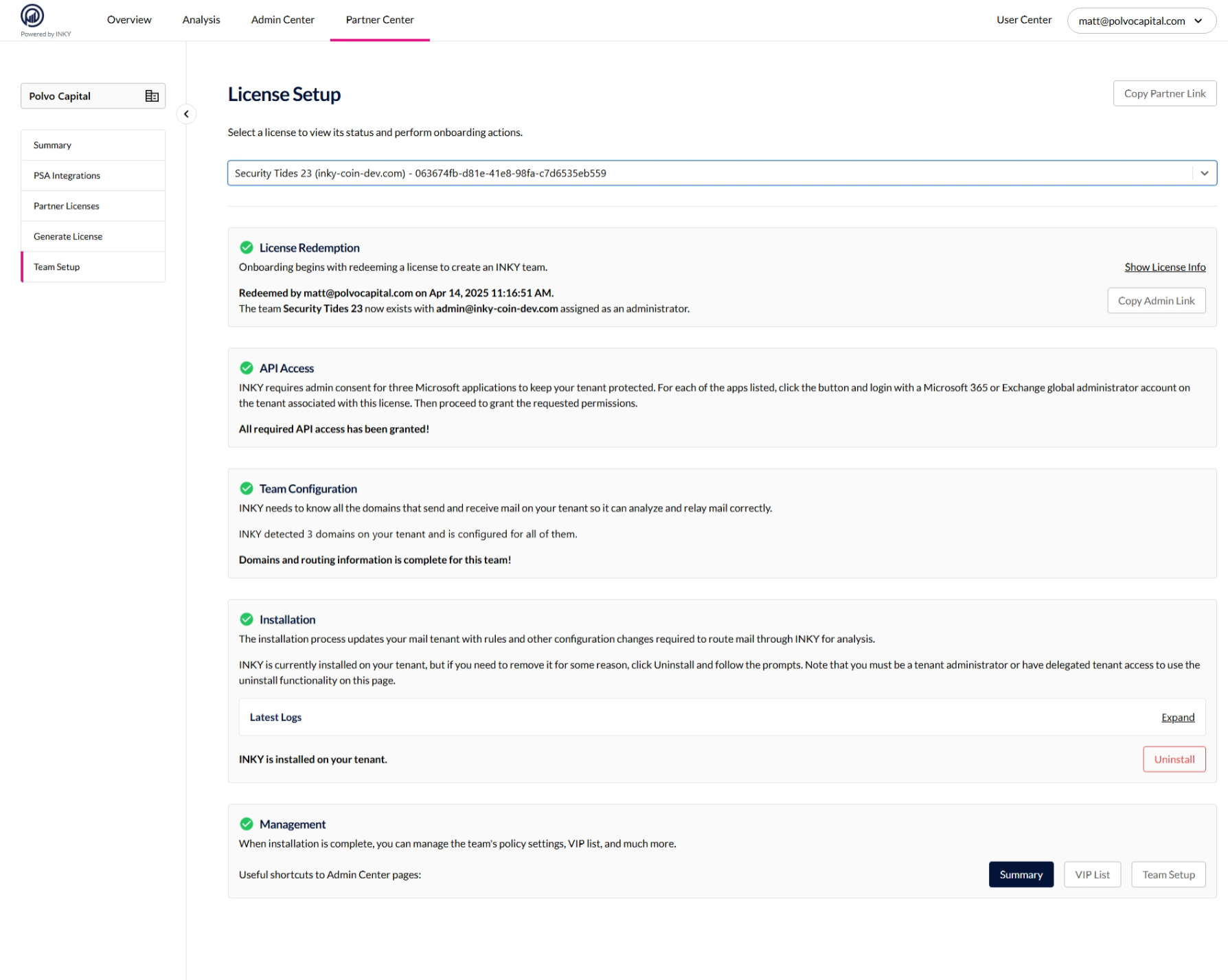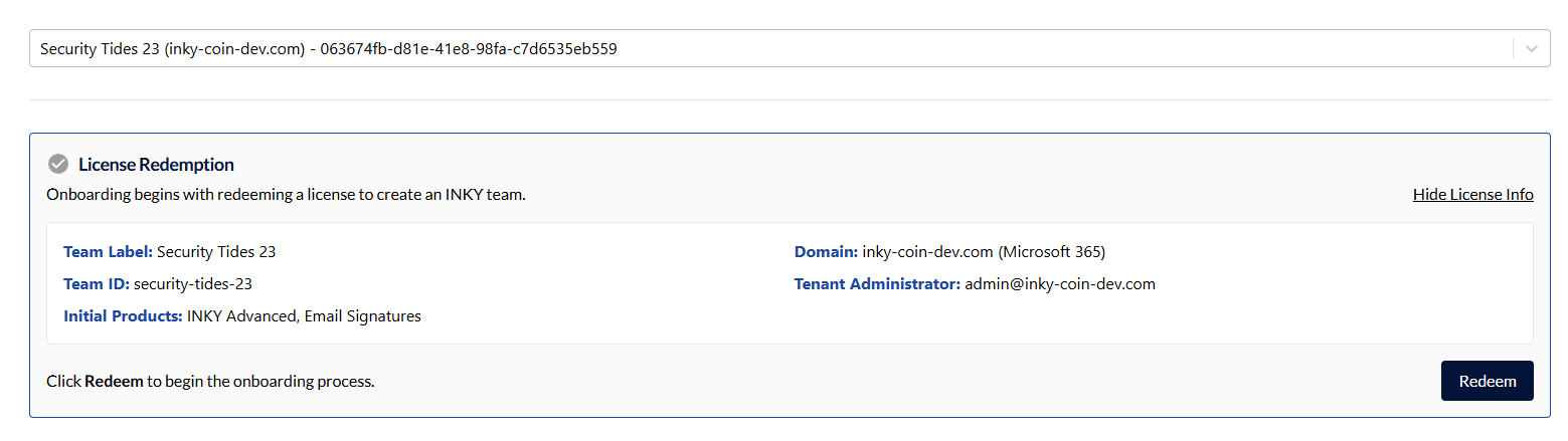 You can utilize the direct link from the generation page to get to Team Setup - INKY or you can navigate directly there. Using the dropdown, you can select the appropriate license you want to redeem and install.