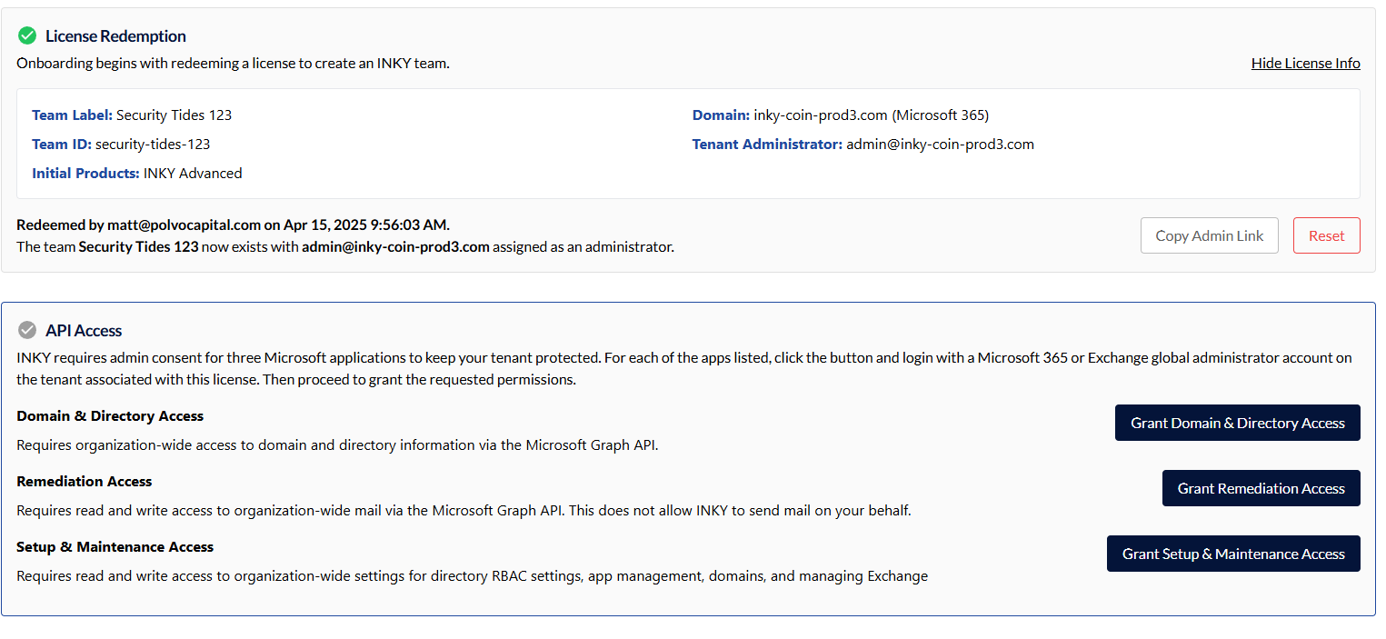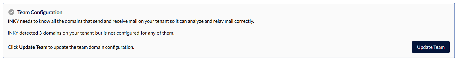 The team is initially configured with the information provided at the license generation step. INKY needs to know all the domains that send and receive mail on your tenant so it can analyze and relay mail correctly. To fully protect all domains on a tenant you’ll need to hit the “Update Team” option next.