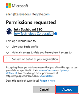 Important: Log into INKY from this tenant and in the Microsoft Permissions requested dialog box, select Consent on behalf of your organization and click Accept.