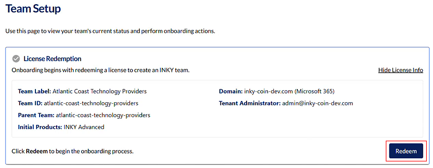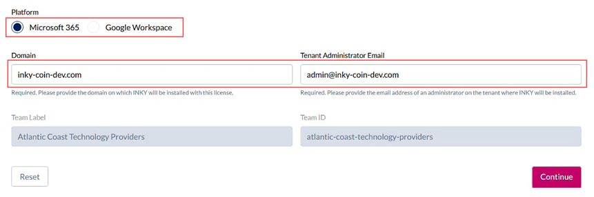 Domain: Enter the primary domain for this installation. For Microsoft, the correct domain is the one ending with onmicrosoft.com. For Google, enter the default domain. INKY automatically detects and protects additional domains on the same tenant.