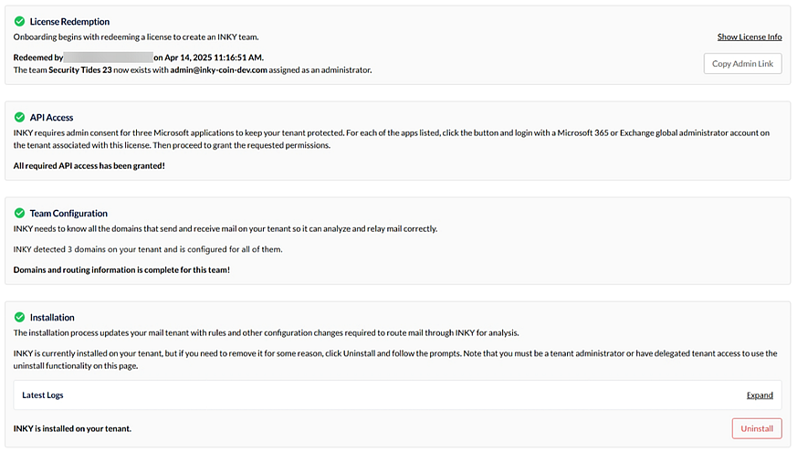 Next, you will install INKY in your email platform by performing the tasks described in each section. When you complete a section, the checkmark preceding the section name will appear green.