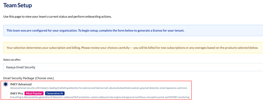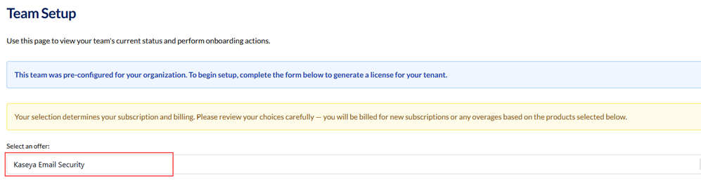 The Team Setup page is displayed. In the Select an offer drop-down list, Kaseya Email Security is the only available option and is selected by default.